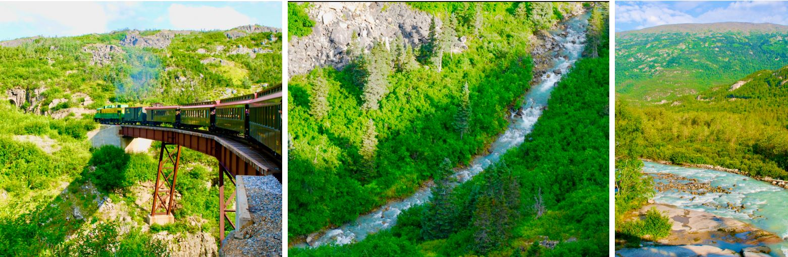 “Built in 1898 during the Klondike Gold Rush, is this Scenic Railway of the World was designated as an International Historic Civil Engineering Landmark. The 3-foot wide Narrow Gauge Railroad climbs almost 3,000 feet in the first 20 miles. It also passes through 2 tunnels and travels over sky-high trestles and bridges. The comfortable restored and replica passenger coaches are pulled by vintage diesel locomotives.”